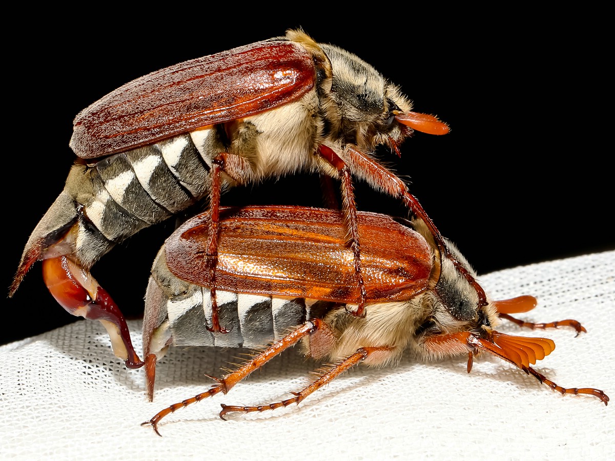 Bei Besuchen der Lichtfanganlage versuchen die Männchen des Feldmaikäfers (Melolontha melolontha) auch immer wieder, anwesende Weibchen zu begatten. Doch ihre Wahrnehmung bei der Partnerwahl scheint manchmal gestört zu sein, denn nicht immer wird wie auf dem Foto ein Weibchen begattet, sondern nicht selten wird so ein Kopulationsversuch auch bei anderen Männchen unternommen. Da die Weibchen lediglich 6 Fühlerfächer besitzen, kann man das sofort erkennen.
