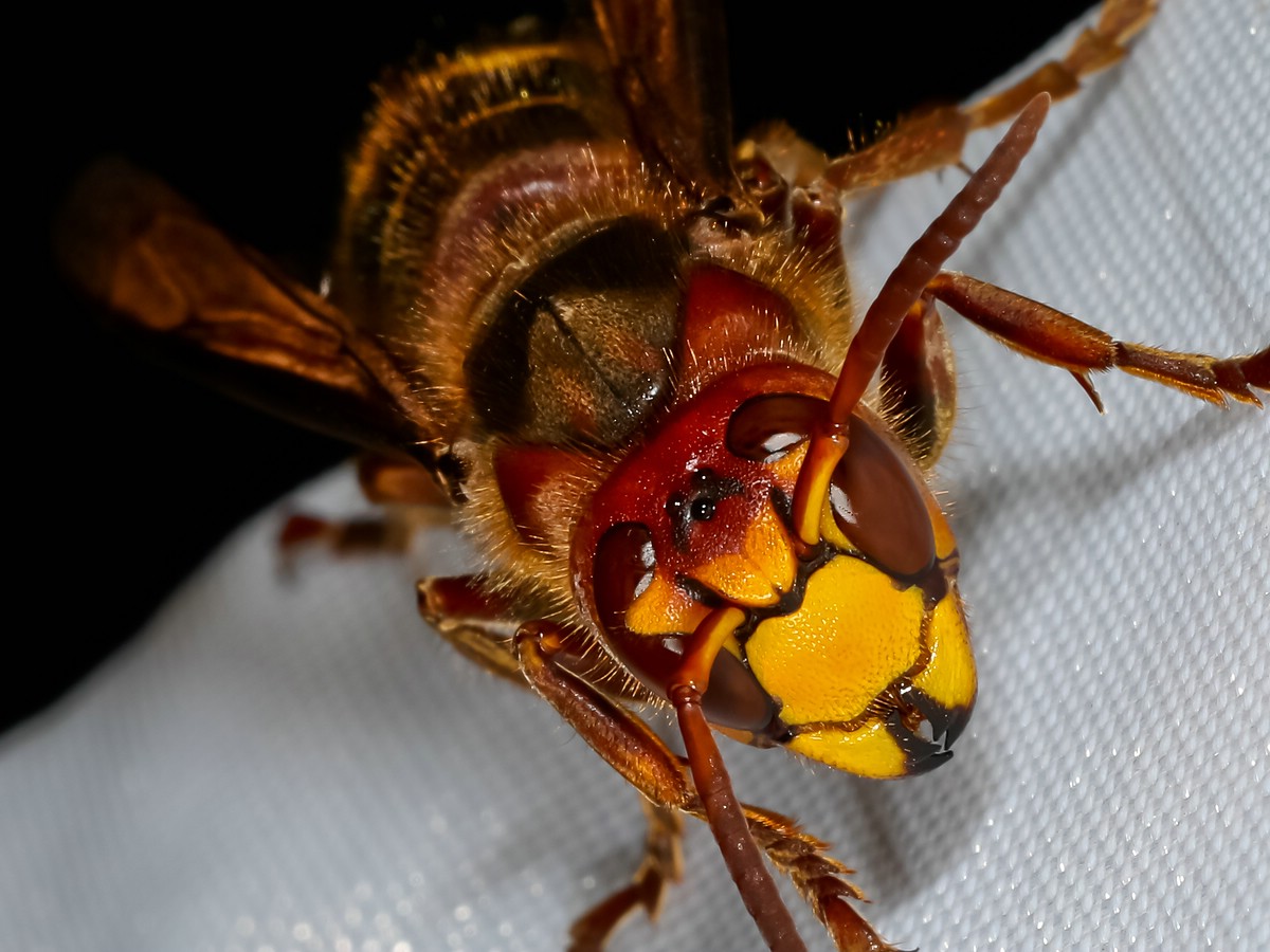 Hornissen (Vespa crabo) kommen häufig zu Lichtfanganlagen, um sich dort satt zu fressen. Dabei bevorzugen sie offen sichtlich kleinere Insektenwie Fliegen und Mücken. Nur ab und zu nehmen sie auch mal ein größeres Insekt wie Köcherfliegen oder Falter. Anschließend verharren sie im Lichtkegel relativ ruhig und scheinen zu schlafen. Dann kann man sich Ihnen durchaus gefahrlos nähern, um Aufnahmen von Ihnen zu machen. Dieses Porträt eines solchen am Licht verweilenden Exemplars entstand in einer derartigen Situation. Man erkennt sehr auf der Aufnahme sehr deutlich die beiderseits des Kopfes liegenden, riesigen Komplexaugen. Dazwischen befinden sich 3 lichtempfindliche Ozellen oder Punktaugen. Daneben fallen an der Kopfunterseite besonders die kräftigen Mundwerkzeuge auf, mit denen sie ihre Beute zerkleinern.