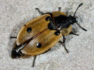 Dieser sehr charakteristisch gezeichnete Käfer der Eichenwälder gehört zur Familie der Aaskäfer (Silphidae). Wie es der deutsche Name zum Ausdruck bringt, ernähren sich die Tiere dieser Familie fast ausnahmslos von Aas. Doch der Vierpunktige Aaskäfer (Dendroxena quadrimaculata) jagt in der Vegetation nach Raupen, Larven von Pflanzenwespen oder auch Blattläusen. Die im Boden sich entwickelnden schwarzen Larven des Aaskäfers jagen ebenfalls dort nach Insektenlarven, fressen aber auch Aas. Bemerkenswert ist, dass sich die Männchen bei der Paarung mit den Mundwerkzeugen an einem Fühler des Weibchens festhalten. Nach der Paarung legen die Weibchen die Eier einzeln im Boden ab. Die Imagines sollen nach Literaturangaben auch die Raupen des Eichenprozessionsspinners fressen.